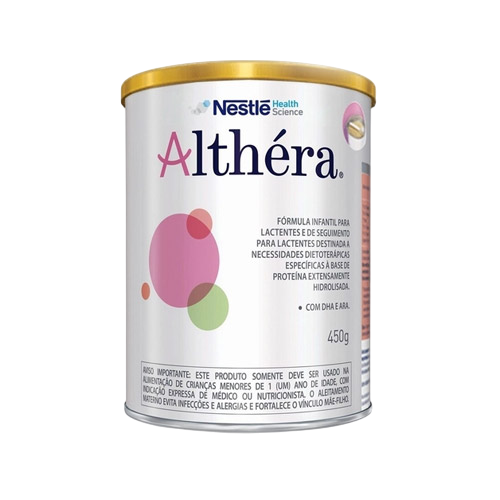 FÓRMULA INFANTIL EM PÓ ALTHÉRA 400G é uma fórmula infantil para lactentes e de seguimento para lactentes e crianças de primeira infância destinada a necessidades dietoterápicas específicas, à base de proteína extensamente hidrolisada. Com DHA e ARA.